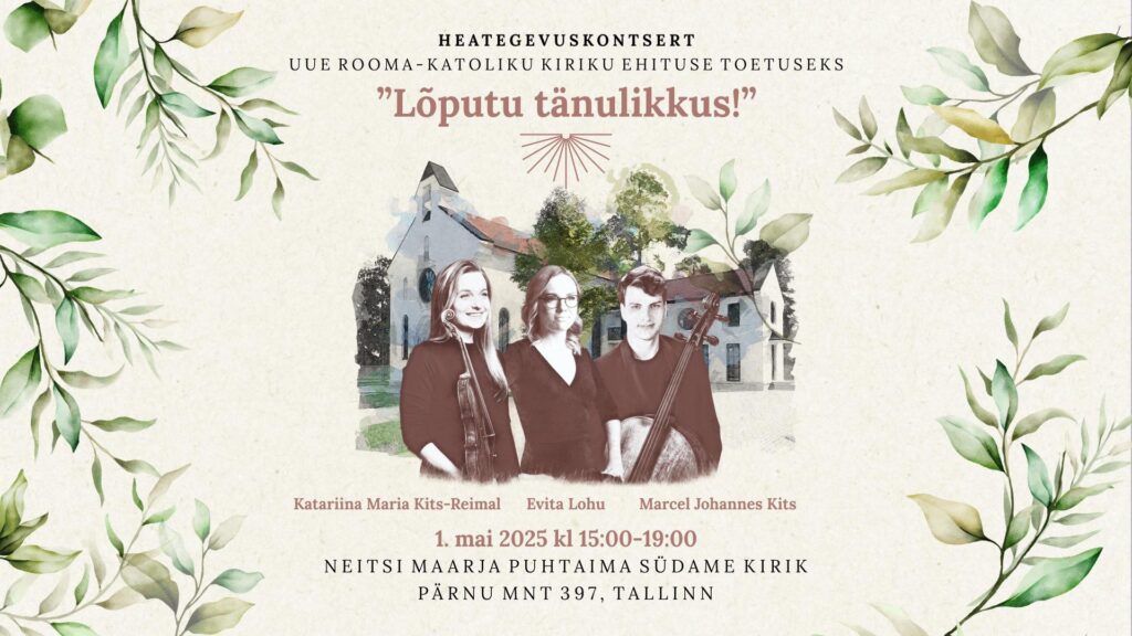 Categories News 1. mai 2025 Heategevuskontsert – “Lõputu tänulikkus!” Post author By sten Post date 1. mai 2025 ← Täna algab noveen preestrikutsumuste eest → II pühapäev pärast Ülestõusmispüha – Hea Karjase pühapäev